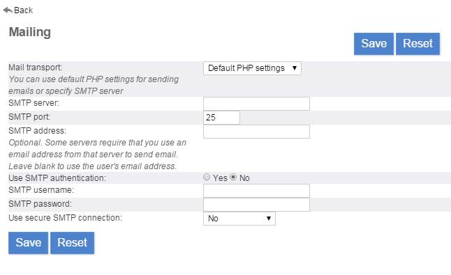 - Mail transport: Lets you choose the method by which mails are sent - by the mailing functions of PHP (requires no further configuration) or by an SMTP server (to be specified below).
