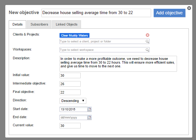 • Clients and projects: Here, you can define the Client or Project that the new objective will belong to.