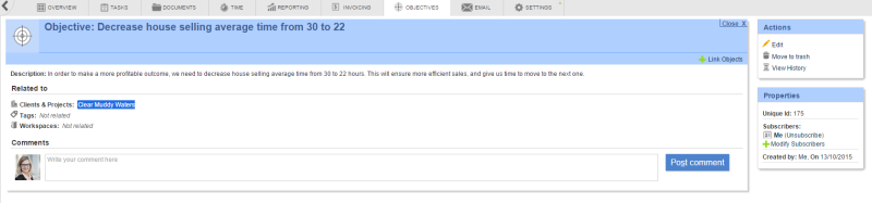 You can also subscribe people to the objective and link objects to it with the tabs “Subscribers” and “Linked Objects.”